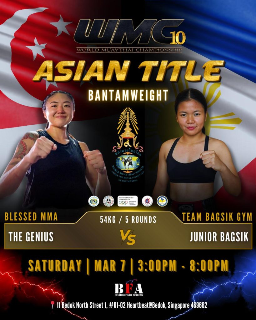 Now Eunicka has the chance to show the evolution of her Muaythai style in her debut fight against Ginny Teo, someone she admires and honored to share the ring with, for the opportunity to be hailed as the new Asian bantamweight champion. She acknowledges that fighting for the title is a big step in her career, and it motivates her to push herself even harder. As a nak muay, Eunicka desires to proudly represent her country, and the WMC gives her the platform to not only do just that, but also reach her dreams. In order to see her aspirations follow through, tune in on March 7th to see who will become the victor in her debut fight!